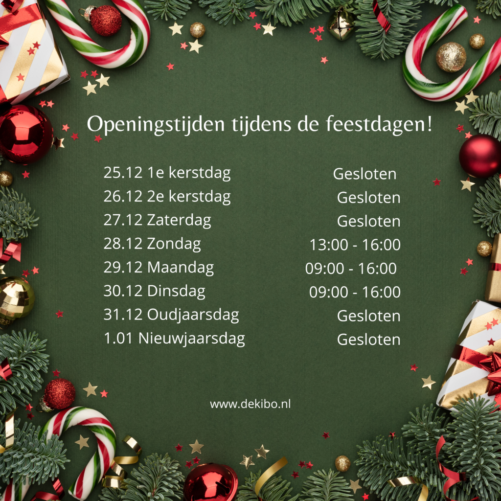 Vanaf 2 januari zijn wij weer volgens onze normale openingstijden geopend. Mocht je nog tussen kerst en oud en nieuw komen, gezellig en wij zien jullie dan! En anders een heel fijn en mooi uiteinde, en tot volgend jaar!